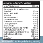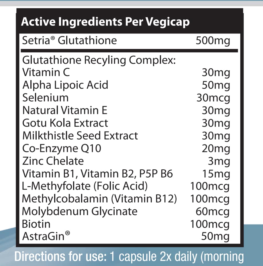 Ingredients:Setria(R) Glutathione 500mg, AstraGin(R) 50mg Recycling complex: – Alpha Lipoic Acid 50mg,- vitamin C 30mg, – Natural Vitamin E 30mg, – Gotu Kola Extract 30mg, – Milk Thistle Seed Extract 30mg, – Co-Enzyme Q10 20mg, – Vitamin B1, – Vitamin B2, P5P B6 15mg, – Zinc Chelate 3mg, – L-Methylfolate (Folic Acid) 100mcg, – Methylcobalamin 100mcg, – Biotin 100mcg, Molybdenum Glycinate 60mcg, – Selenium 30mcg
